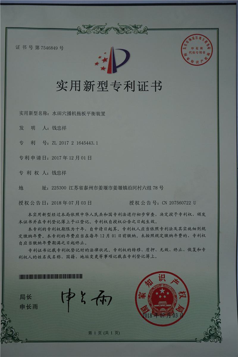 泰州市金茂田農機制造有限公司,位于風景優美的江蘇省泰州市姜堰區。公司成立于2005年,經過十幾年的發展公司已成為江蘇省質量誠信3A級品牌企業。泰州市金茂田農機制造有限公司目前擁有標準化廠房約1萬平方米,擁有多臺自動化焊接設備及自主研發專業配套數控機床、先進的材料分析儀。并擁有專業技術研發團隊,技術人員30人,員工100人。金茂田公司創始人錢金茂老先生從1976年從事農機研修工作一直到如今,在農機領...